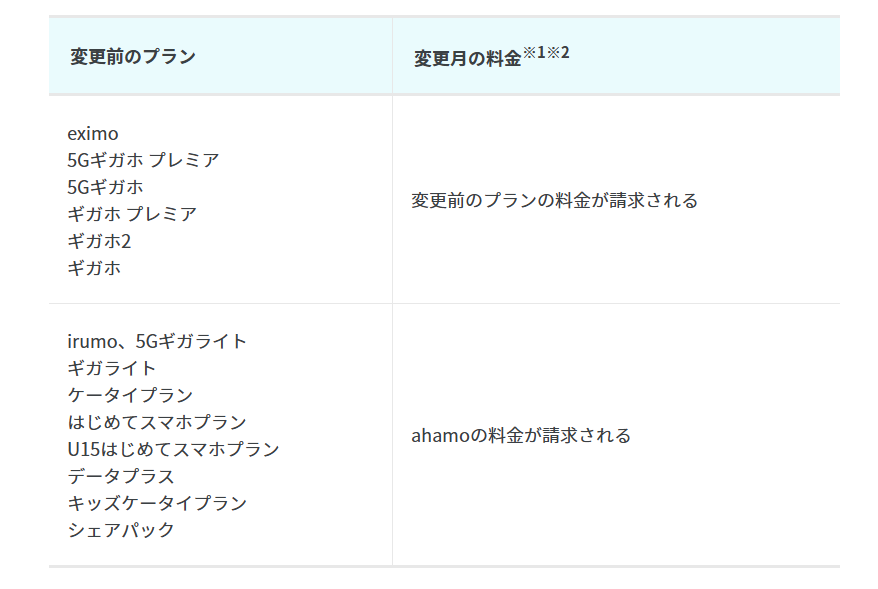 ドコモからのプラン変更の場合、変更前のプランによって請求される料金が異なります。