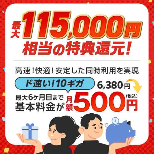 高速回線に興味はあるけれど月額が気になる、という人には10ギガのキャンペーンが後押しになります。