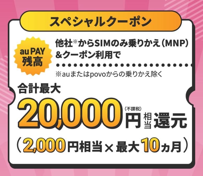 | 特典 | 合計20,000円相当のau PAY残高還元 (10ヵ月間2,000円(不課税)相当) |
